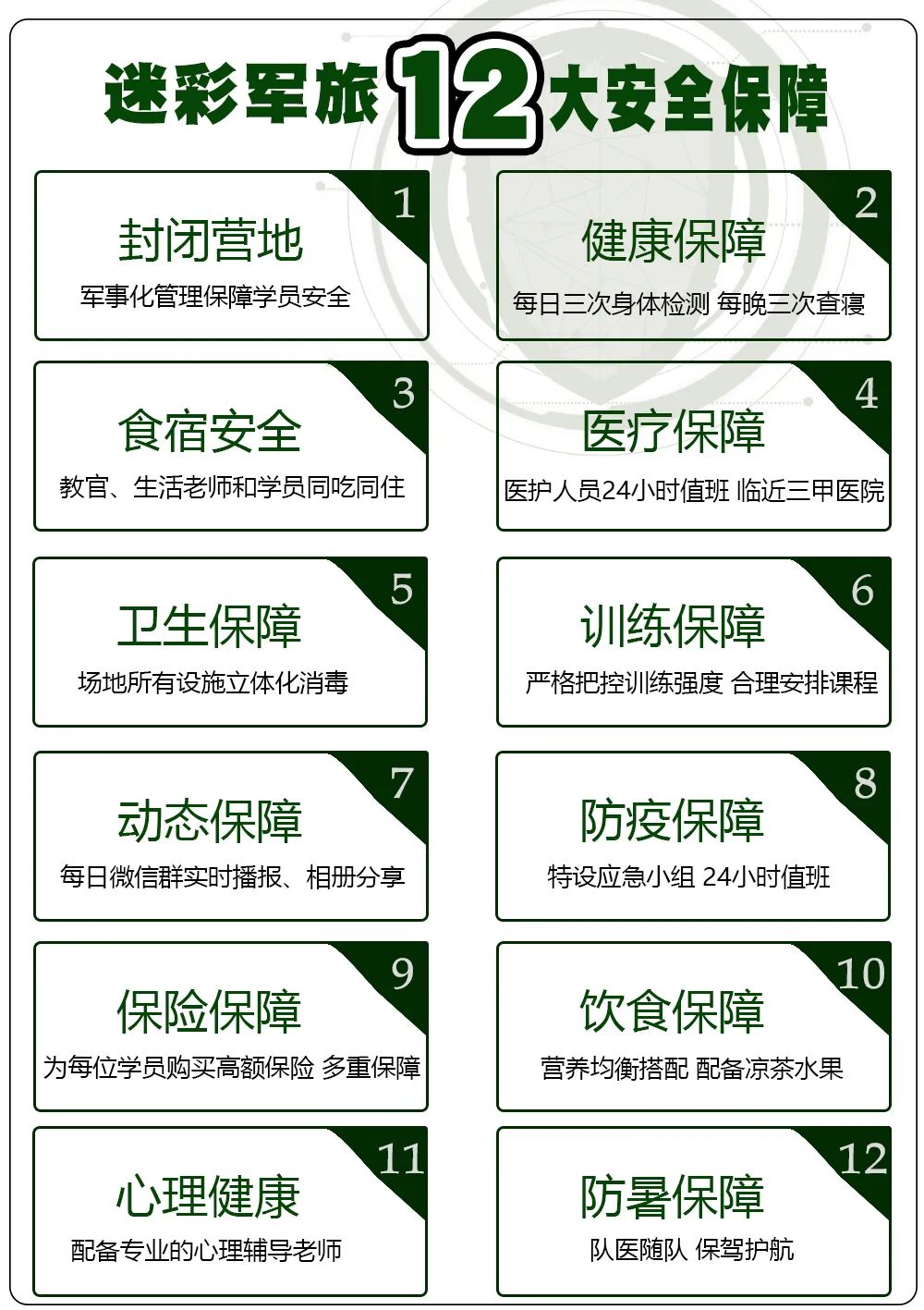 1、营地保障:营地采用全封闭式,军事化管理,时刻保障营员的人身安全。
