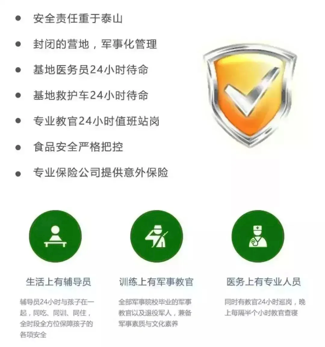 1、营地保障:营地采用全封闭式,军事化管理,时刻保障营员的人身安全。