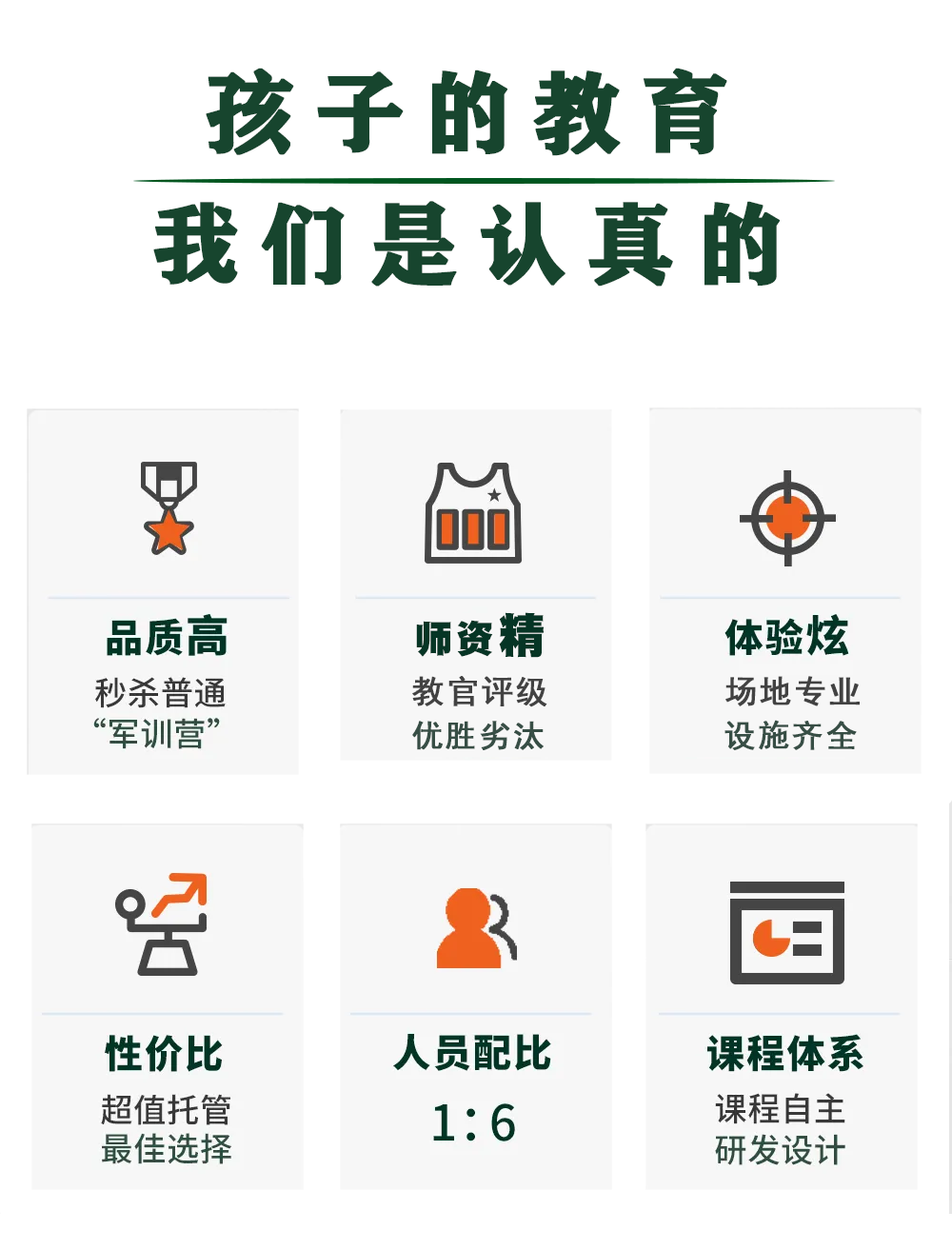 “迷彩军旅夏令营”多年来秉持教育成就未来的理念,专注打造高品质青少年军事特色夏令营,践行青少年户外成长教育。通过合理的军事特种训练磨炼营员的意志,用军事体验式训练提高营员的综合素质。